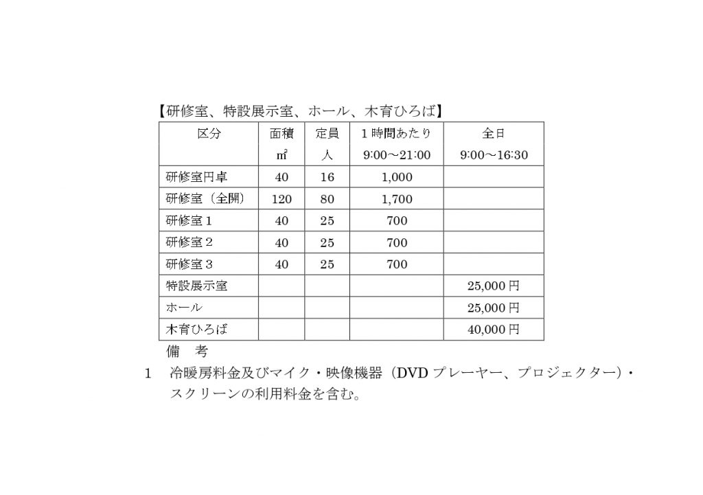 なお、研修室に限り、16時30分以降に利用がある場合は21時までとさせていただきます。