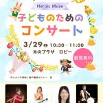 オホーツクの子どもたちのために演奏活動をしている「Heroic Muse」さんのコンサートです。 お子さんが知っている楽しい曲ばかり演奏されますよ。会場はお話ししても遊んでも大丈夫、リラックスして音楽を楽しみましょう! […]]]>お子さんが知っている楽しい曲ばかり演奏されますよ。