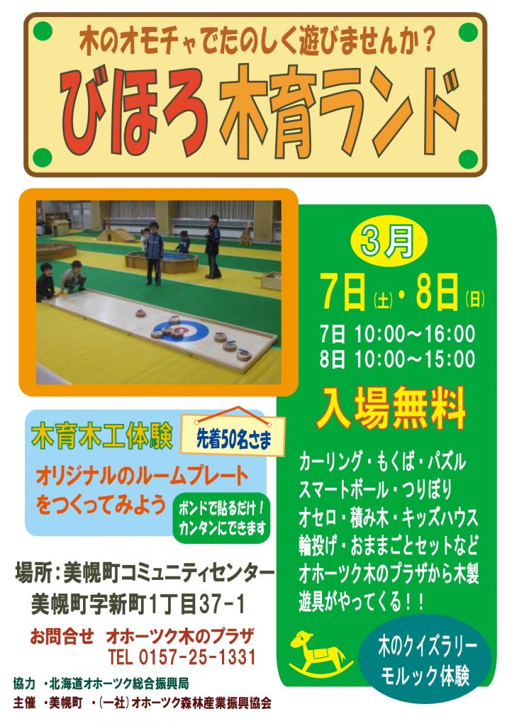 木のおもちゃで楽しく遊びましょう!木製遊具のゆうえんち木育ランドを美幌町で開催いたします。 モルック体験や木のクイズラリー(完走者に景品あり!)木工体験コーナーもありますよ。入場無料ですのでご家族でお越し下さい。]]>モルック体験や木のクイズラリー(完走者に景品あり!)